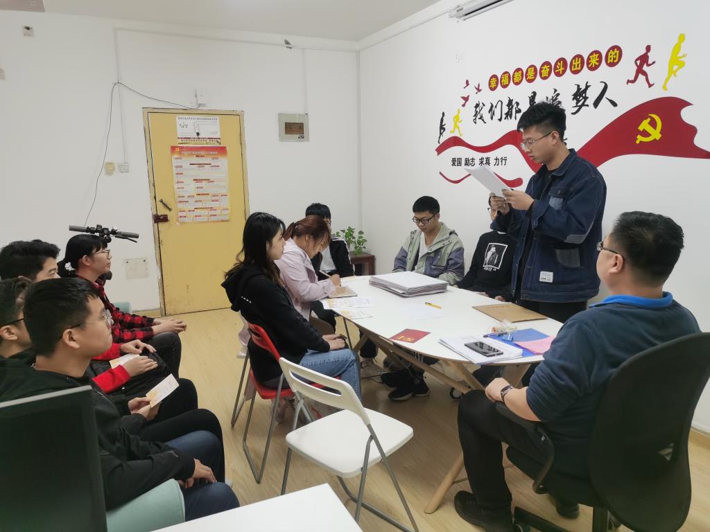 大会伊始,组织委员刘安宣读会议流程、讨论和表决原则,要求每一名党员都要认真负责地表达自己的想法,投出庄严的一票。会上,余磊、孟宝军等四名发展对象相继宣读入党志愿书,对自己在发展考察期内的思想、工作、学习等方面的情况做以汇报,再由入党介绍人介绍相应发展对象在培养考察期内的大体情况。随后,大会对发展对象的入党议题进行讨论,在此过程中,参会的党员对发展对象相继发表了自己的看法,对讨论入党的发展对象既表扬了其优点,也指出了不足。在各位党员发表完意见之后,支部书记薛鹏也发表了自己的意见和建议,并对讨论结果进行总结。在听取完大会讨论后,余磊、孟宝军等四名发展对象分别表示出自己积极上进的态度和决心,愿意继续接受党组织的审查和考验,发扬优点,改正不足,以一名共产党员的标准严格要求自己。最后经投票表决同意接收余磊、孟宝军等四名发展对象为中共预备党员。