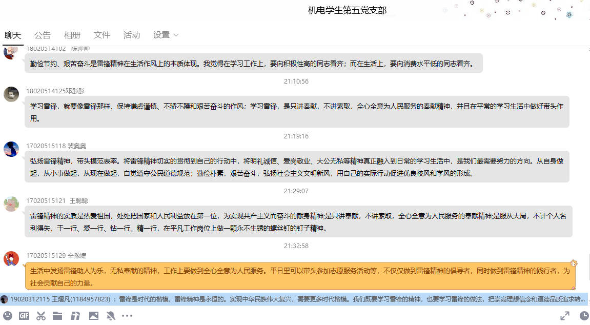 随后,同志们积极学习了雷锋同志的先进事迹。从雷锋同志的人生经历中,我们认识到传承雷锋精神是我们每个党员的义务,更是我们必须肩负起的历史责任。党员们在党支部群内各抒己见,发表了自己对雷锋精神的感想和心得,党员们都表示收获很大。雷锋精神,是中共党员面貌的集中体现,员工党员学习雷锋精神特别要学习他为人民服务,不计较个人得失的精神,学习他在任何岗位上都爱岗敬业,甘心做一颗螺丝钉。