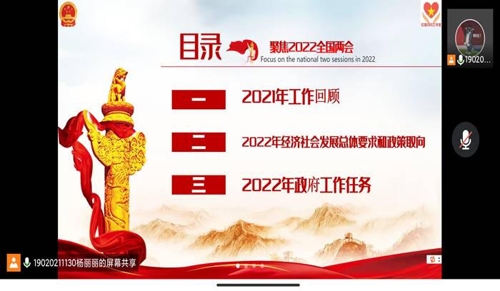 2022年3月14日中午,申搏sunbet员工第七党支部在腾讯会议召开学习2022全国两会政府工作报告大会,对全国两会政府工作报告会议的内容进行集体讨论与学习,本次大会由支部杨丽丽同志主持。