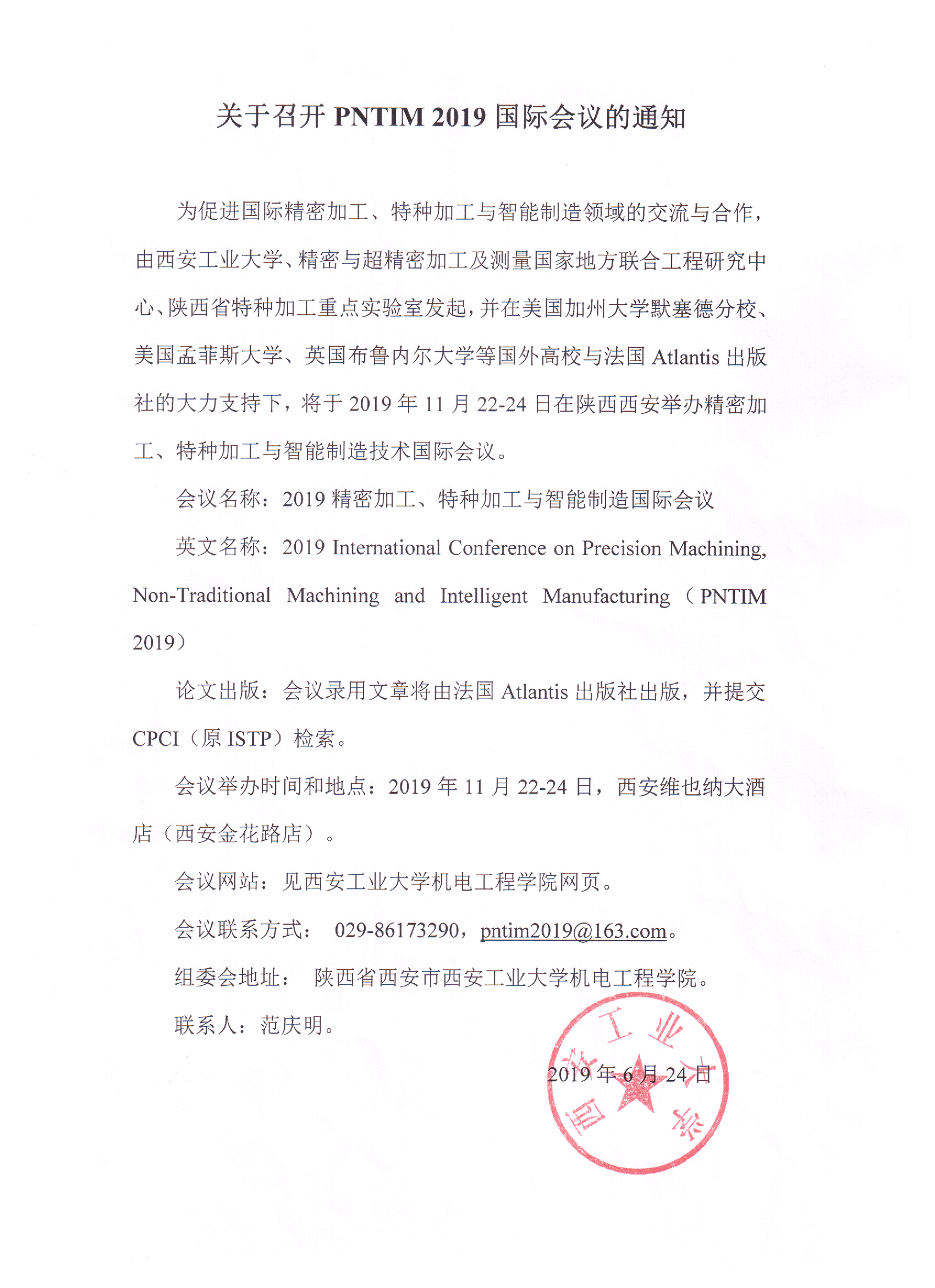 为促进国际精密加工、特种加工与智能制造领域的交流与合作,由申搏sunbet、精密与超精密加工及测量国家地方联合工程研究中心、陕西省特种加工重点实验室发起,并在美国加州大学默塞德分校、美国孟菲斯大学、英国布鲁内尔大学等国外高校与法国Atlantis出版社的大力支持下,将于2019年11月22-24日在中国西安举办精密加工、特种加工与智能制造技术国际会议。会议录用文章将由法国Atlantis出版社出版,并提交CPCI(原ISTP)检索。