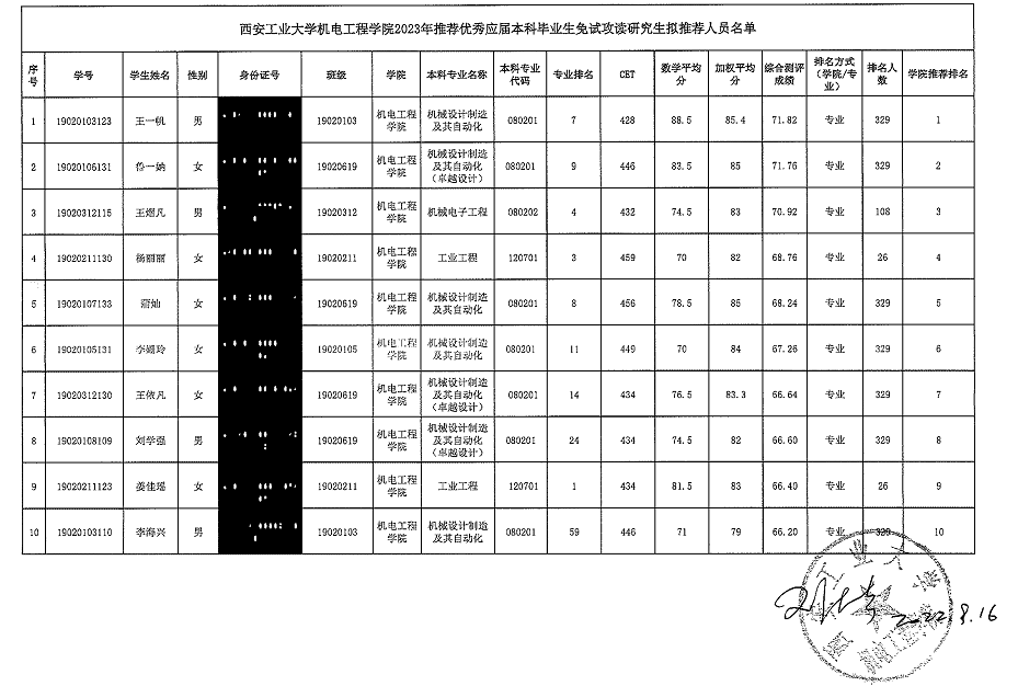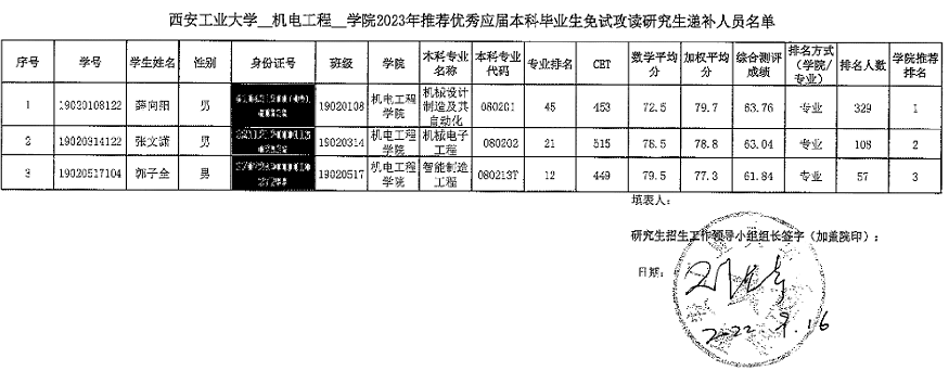 2023年推荐优秀应届本科毕业生免试攻读研究生拟推荐人员名单