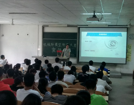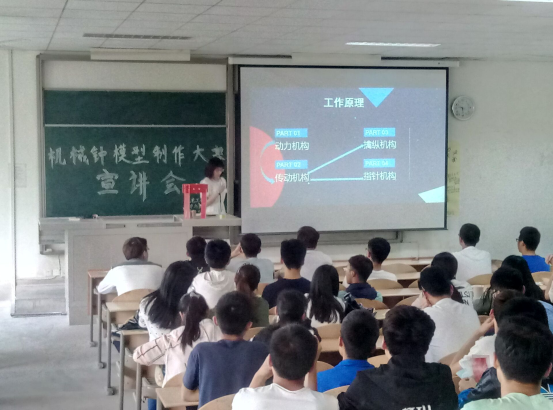 此次会议到场的有30多组参赛选手,主要内容是对机械钟的工作原理和制作要领作出详细讲解。院科协主席张凯文和科协副主席杨叶茜分别通过PPT和视频详细讲解了机械钟的工作原理、机构组成、制作要点以及比赛规则,和同学们分享了比赛中的心得体会,点出了选手们参赛中的一些问题,也为同学们提供了一些比赛方向。通过对机械钟的剖析,使同学们对机械的传动理解更加透彻,同学们对机械钟的制作有了更大的把握。使同学们更加直观地了解了机械钟的工作原理,在同学们心中留下了深刻印象。
