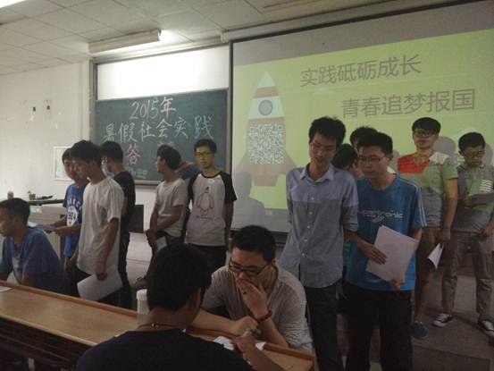 2015年5月25日下午18:00,申搏sunbet在教2-201举行2015年暑期社会实践答辩会。本次答辩会评委有申搏sunbet青年志愿者协会主席潘兵、员工会副主席何俊、组织部部长胡俊杰以及体育部部长杨浩林。