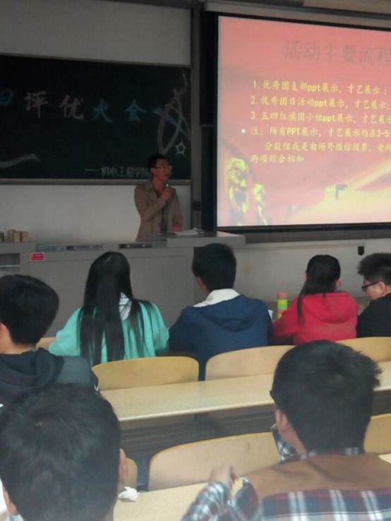本次评优大会主要是通过主题答辩和风采展示的形式:评选出五四红旗团支部5个、五四红旗团小组10个、优秀团日活动5个。在同学们的热烈掌声中,黄彦军老师做了致辞,对各位部长们的尽职尽责表示了积极的肯定,对团组织的团聚上进也表示了高度的赞扬,同时,黄老师要求同学们本着公平、公正的原则,筛选出在公司共青团工作中表现突出的基层团组织,以此激励同学们不断将正能量传递其他同学。紧接着,是各个参赛班级的活动风采展示环节,通过PPT播放形式展示了班级同学的花样风采,在现场,也不乏感人至深的演说和动人美妙的歌声。场上是一幕幕精彩地角逐,台下是评委们难以取舍地打分。