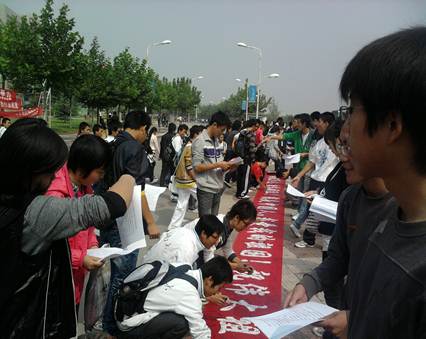 签名活动正式开始后,在巨大横幅感召下,同学们激情豪迈,纷纷用笔留下祝福祖国的话语。一些西工学子还以饱满的爱国热情写下激昂的保钓宣传,将“两耳不闻窗外事,一心只读圣贤书”的传统书生形象彻底丢尽了历史的垃圾堆。活动即将结束时,更有一男同学站在饭堂三楼外的阳台上大喊“中国加油”,随后在“国”字旁写下“西工学子请战!”的豪言壮语。最后,在激昂的国歌声中,申搏sunbet“庆祝国庆铭记历史”活动圆满落下帷幕。