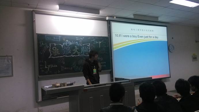 决赛于5月13日在教2-301举办,共分为风采展示,知识问答,接歌词三个环节。