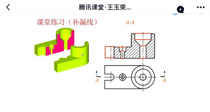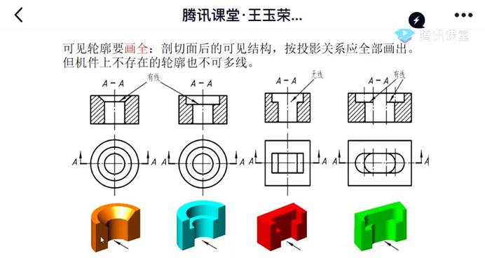 授课内容:分析视图中的错误;全剖视图、半剖视图、局部剖的标注