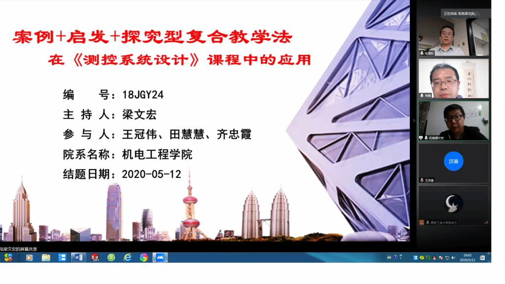 为了做好远程互动式视频答辩,申搏sunbet克服了软件和网络不稳定问题,提前做好各类准备工作,以保证视频答辩的顺利进行。虽然是远程互动式视频答辩,但是线上与线下答辩的流程、要求不变,申搏sunbet教学秘书将所有材料都做了数字化处理,提前将电子版结题答辩材料发给专家审阅,保证线上答辩质量不掉线。整个答辩过程均录屏截图,作为答辩记录留存,坚决确保答辩的公开性和真实性。在答辩过程中,项目负责人分别介绍了项目的预期目标和实际研究进展情况,并围绕项目的创新点、实际教学效果、存在问题和改进措施等做了较详细的汇报。根据项目负责人的汇报,专家组分别进行了问题质询,与项目组进行了充分且深入的交流,并给出了进一步完善的意见和建议。