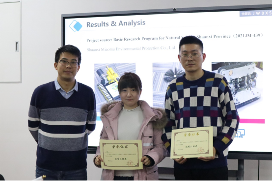 当天下午,分会场暨颁奖典礼分别在工2-221和工2-310举行,特邀了青年教师赵晓龙、张耿作为评审专家。来自公司的16位博士、硕士研究生进行了充分的学术报告交流与讨论,分享了各自的研究成果,取得了良好的学术交流效果。最终,分会场专家评委从汇报论文的学术创新水平、英文表达流畅度、PPT讲稿制作等方面综合考虑,评选出了4名优秀汇报员工,分别是2020级博士研究生张亚东(导师:王建华教授)、2019级研究生徐睿(导师:肖强教授)、郑雅泽(导师:唐霖教授)、2020级硕士研究生韩凡滨(导师:尹培丽博士),评委分别为获奖选手颁发了证书。大会在一片热烈的掌声中落下帷幕,取得了圆满成功。最后,全体参会人员合影留念。
