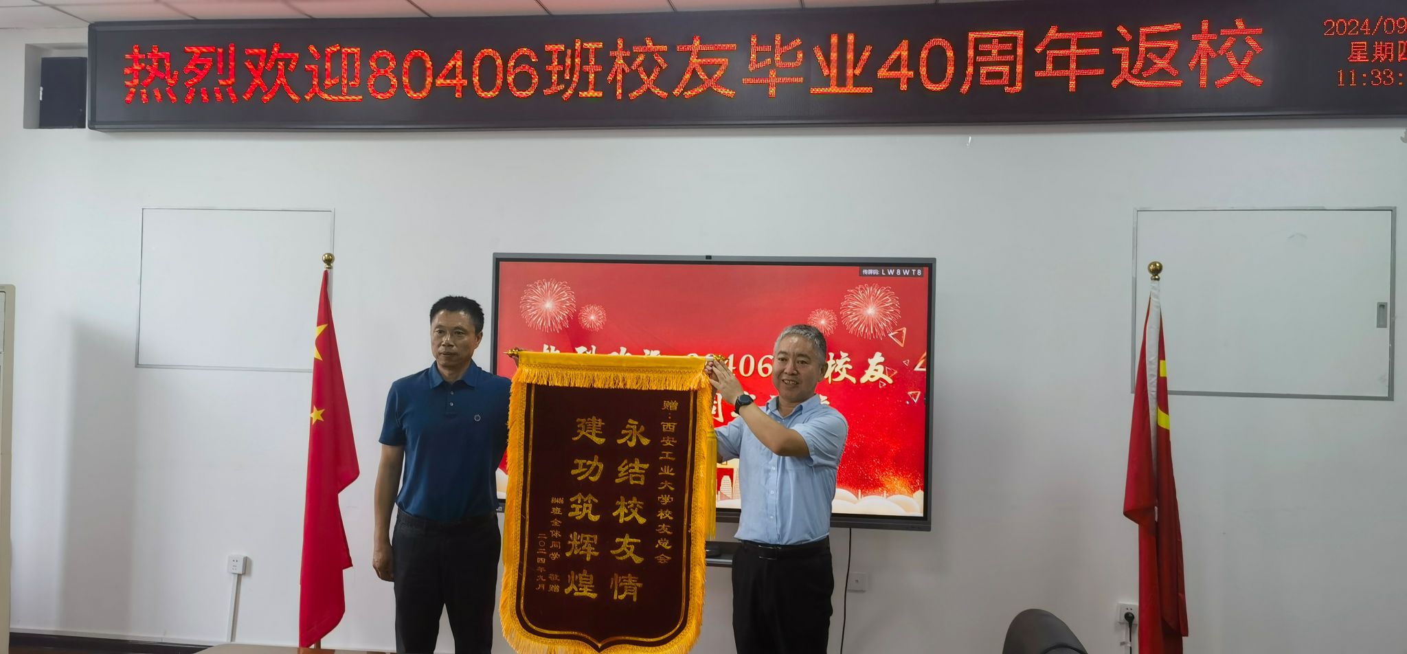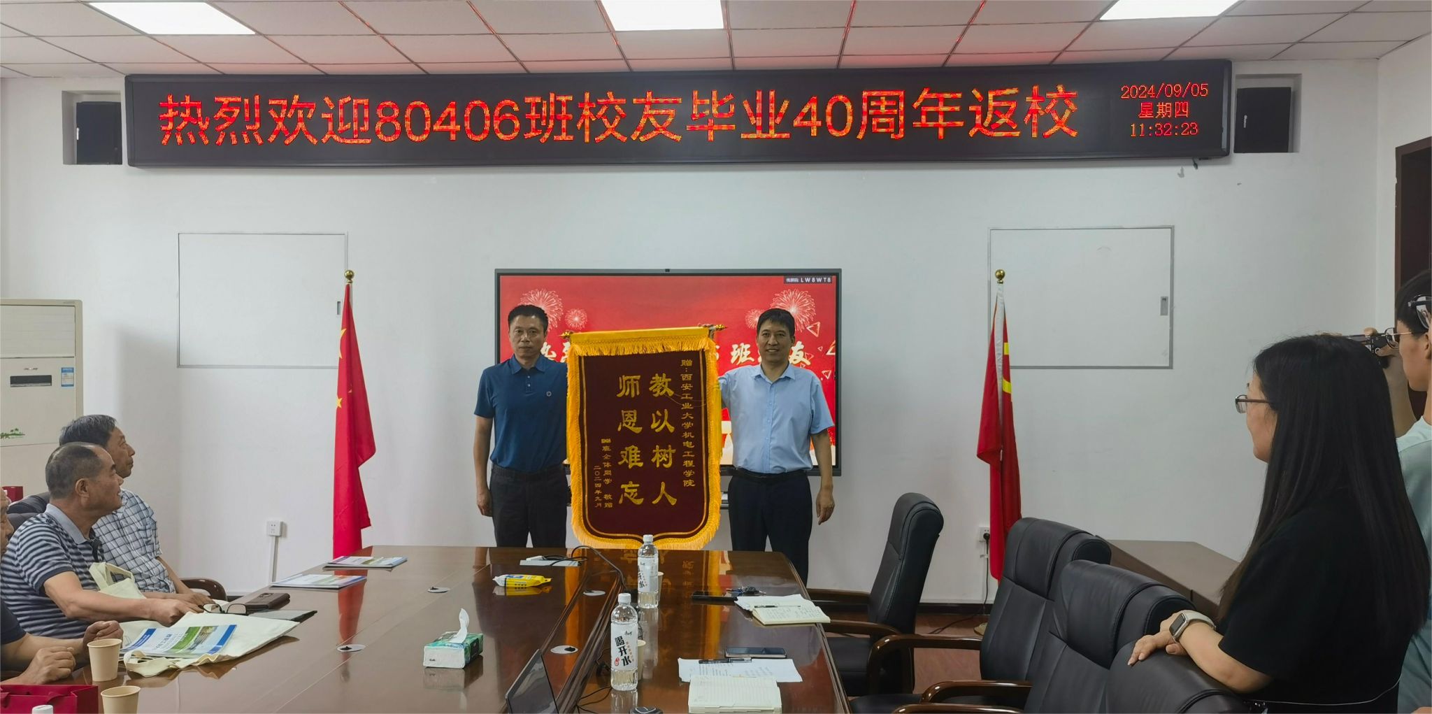 80406班班长李翔代表返校员工回忆了在母校度过的那些青葱岁月,对那段充满汗水与欢笑、知识与成长的时光表示了深深的怀念。同时,他也代表全体员工,对母校和老师们的辛勤培育表示了最诚挚的感谢,正是有了这份无私的奉献与引导,才让他们能够在各自的领域里发光发热、成就一番事业。期待着母校培养更多优秀人才。为表达对母校的感激之情,员工代表向公司赠送“教以树人 师恩难忘”锦旗,向员工总会赠送“永结员工情 建功筑辉煌”锦旗。