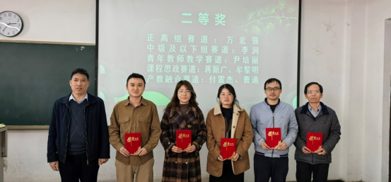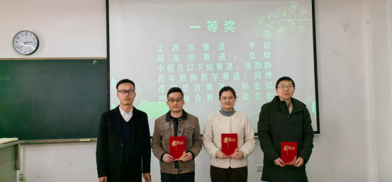 随后由书记程新峰为一等奖获得者颁发证书。分别是正高组赛道的李蔚,副高组赛道的张耿,中级及以下赛道的张静静,青年教师教学竞赛赛道的邱博,课程思政赛道的孙金绢,以及产教融合赛道的梁文宏。