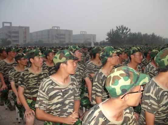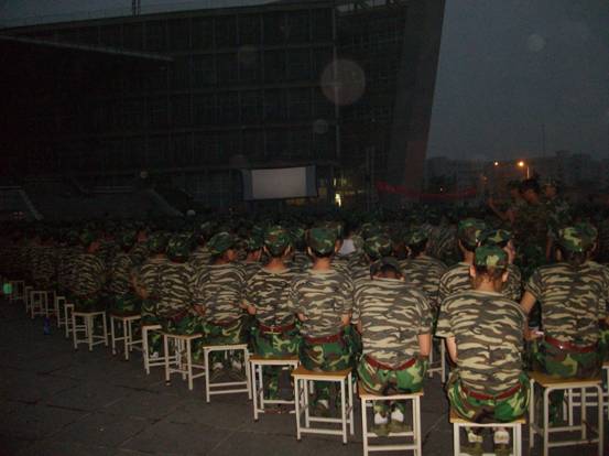 辛苦而又快乐的一天军训结束了,晚上,大家一起看电影,进行军事学习。