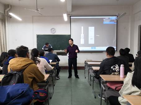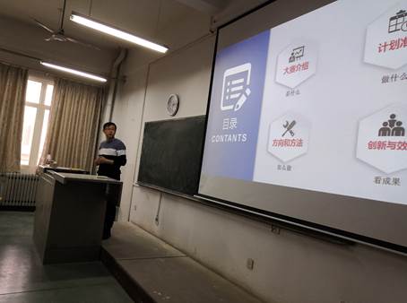 会议伊始,张晖老师介绍了大赛流程主讲人宋荣新的简历。宋荣新老师上台为各小组成员详细介绍了本次竞赛的时间、类别、内容、规模及历年比赛承办等方面信息,让在场的同学对本次活动有了初步的了解。随后,宋荣新老师从大赛活动介绍、计划准备、方向方法、创新与效果这四个方面对本次竞赛进行了详细的介绍。通过宋老师的介绍,不仅提升了小组成员的参赛热情,还让大家对该竞赛有了更加深入的了解,进一步增强了大家的比赛信心。接着,张晖老师上台做总结发言,并让在场的同学积极提出自己的问题,就所收集到的问题进行一一解答,消除同学们的疑惑。