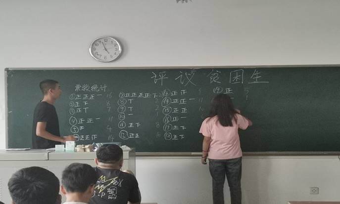 会议伊始,辅导员宣读了《2019-2020学年家庭经济困难员工认定工作安排》,让员工充分理解贫困生资格的评定规则。其次由班长现场给贫困生申请书编号,并随机在班中抽选未申请的一名同学朗读申请书,申请书中不出现个人信息,保证过程公平公正。随后,评议小组依据评议规则和申请书内容做出投票,匿名写下申请书编号,每人五票,统一收至班长处。接着,现场抽选两位同学唱票、计票,并统计投票结果。期间,班主任老师向同学们强调在今后的学习和生活中需要注意的要点,强调在丰富课余活动的同时要注重学习,把学习放在第一位。同时指出,同学们在学习和生活上遇到困难要积极寻求帮助,及时解决。至此,各班贫困生资格名单已出炉,目前贫困生评议工作正处于公示阶段。