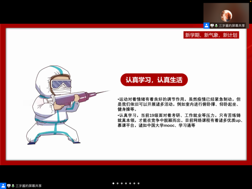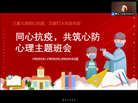 2022年1月10日午,申搏sunbet19级1、2、3班在线上召开了以“同心抗疫,共筑心防”为主题的心理班会。会议由辅导员张晓君主持主讲,分享了关于疫情防控下封闭生活如何保持积极良好的心态的方式方法。