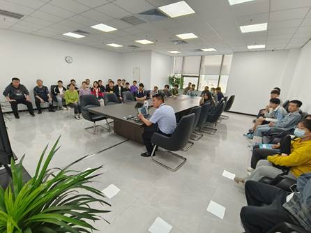 人力资源部校招专员席守丞负责接待公司师生。在他的带领下,员工们参观了隆基乐叶公司,听取了关于公司发展概况、重点发展战略及产业布局的介绍,简要了解了单晶硅片、电池组件等创新产品,感受了企业的特色文化。通过现场解说、视频资料向大家介绍了公司的招聘需求,并就本次面试流程及注意事项作了详细说明。