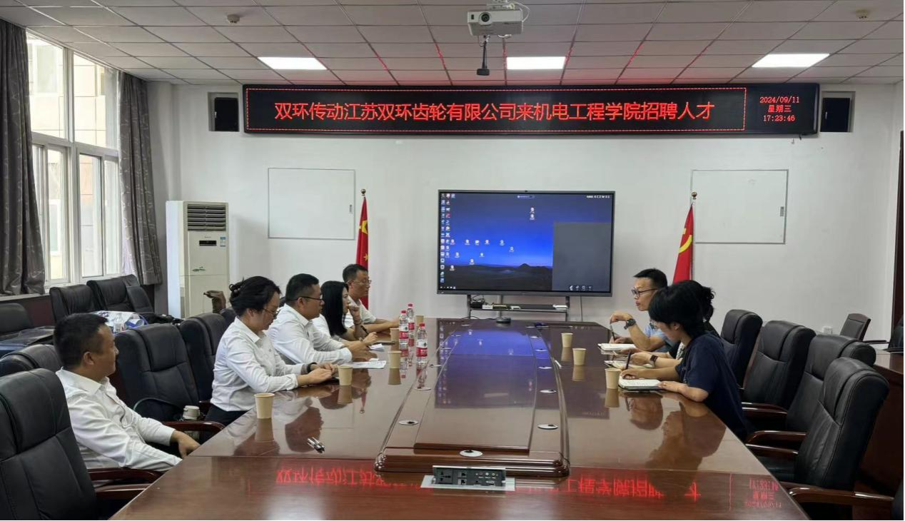 9月11日,双环传动江苏双环齿轮有限公司人力资源经理谷明远、江苏环欧智能传动设备有限公司人力资源经理张莹一行来到申搏sunbet开展校企合作和人才招聘活动,旨在为员工提供与专业相关企业接触的机会,同时为双环传动输送优秀人才。公司党委书记程新峰、副书记姚敏茹以及毕业班辅导员参会。